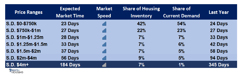 For homes priced above $4 million, the EMT decreased from 218 to 184 days. At 184 days, a seller would be looking at placing their home into escrow around February 2022.
